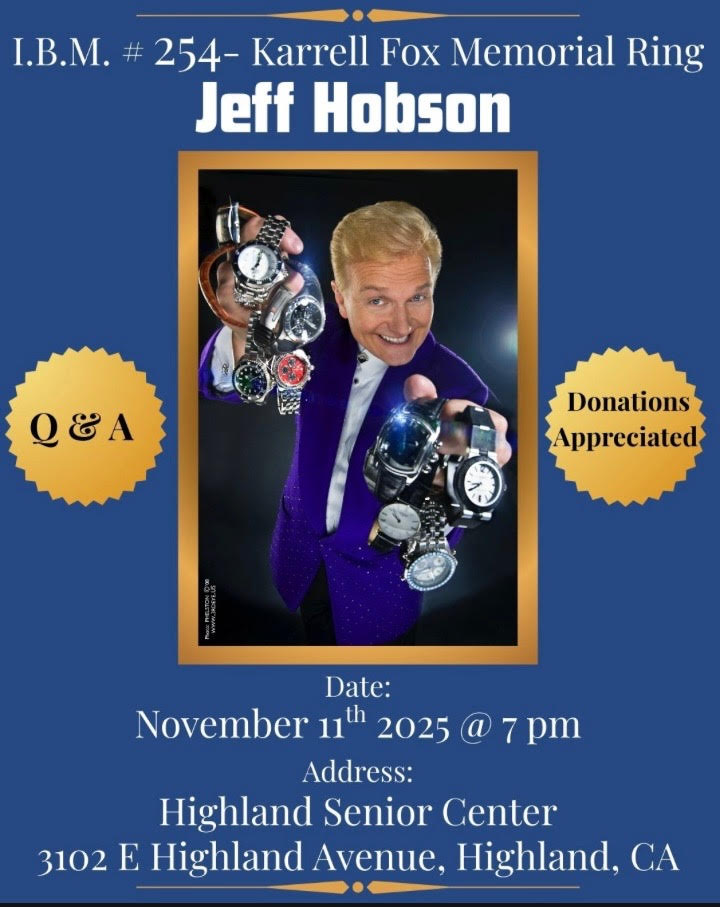 We are club for those who perform MAGIC either for a living or a hobby or for performing for family and friends. If you are one of these or have an interest in magic, this club is for you. We have been in the Highland area of San Bernardino for a long time and meet the second Tuesday of every month at 7:30 PM. Meetings currently held at: